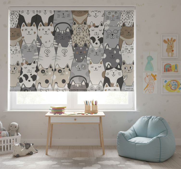 매력적인 패턴은 다양한 표정과 장난기 가득한 디테일을 보여주는 귀여운 고양이 얼굴들을 배열하고 있습니다. 각 고양이는 독특한 디자인으로, 점, 줄무늬, 수염 등 뚜렷한 무늬를 가지고 있으며, 부드럽고 차분한 회색, 흰색, 갈색의 색조를 배경으로 하여 시각적으로 매력적인 구성을 만들어냅니다. 아동용 블라인드 만화 고양이 디자인