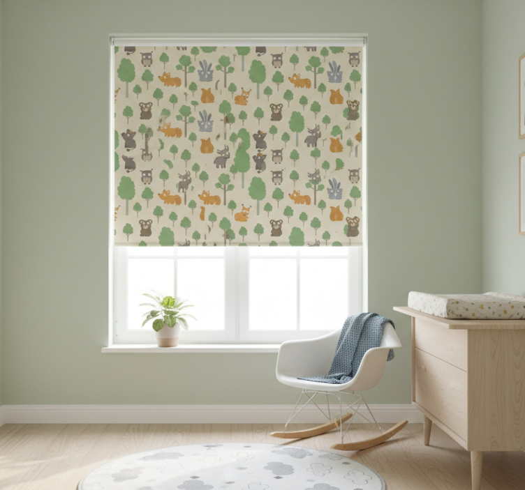 울창한 녹색 나무들 사이에서 코알라, 여우, 토끼와 같은 장난기 가득한 동물들이 어우러진 생동감 넘치는 디자인. 이 매혹적인 패턴은 각 사랑스러운 캐릭터와 그들의 푸르른 환경이 자연의 기쁨을 담아내며 활기찬 분위기를 만들어냅니다. 즐겁고 초대하는 공간을 만드는 데 완벽합니다. 아동용 블라인드 귀여운 동물과 나무 디자인