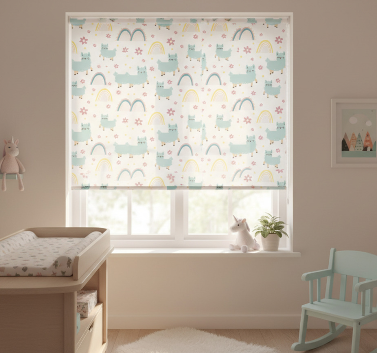 재미있는 라마, 섬세한 꽃, 그리고 생동감 넘치는 무지개로 가득한 매력적인 디자인. 파스텔 블루와 핑크의 부드러운 색조가 기발한 매력을 더욱 강조합니다. 각 요소는 밝고 기쁜 분위기를 더해, 이 디자인이 있는 공간에 미소와 즐거움을 초대합니다. 아동용 블라인드 양과 유니콘 패턴
