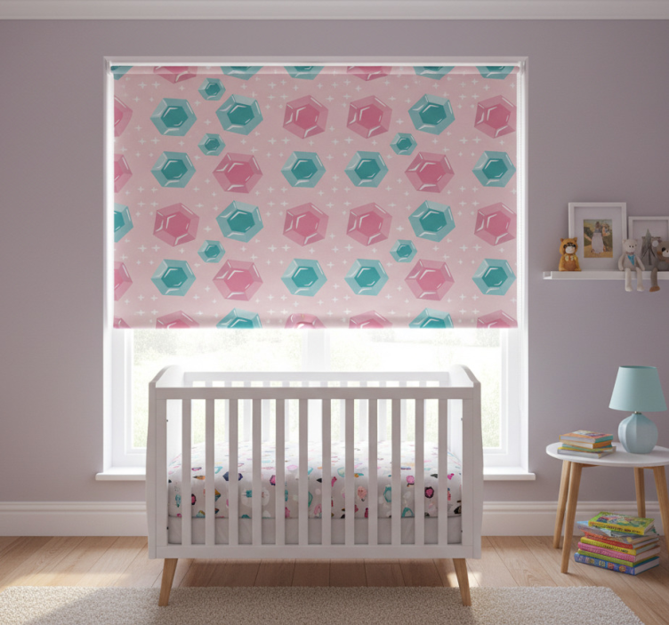 분홍색과 청록색의 다채로운 육각형 모양이 매력적으로 디자인된 작품으로, 작은 별 모양의 장식이 더해져 있습니다. 연한 분홍색 배경은 생동감 있는 기하학적 모티프를 강조하여 즐겁고 유쾌한 시각적 매력을 제공합니다. 경이로움과 창의성을 불러일으키기에 이상적입니다. 아동용 블라인드 기하학적 보석 톤 보석