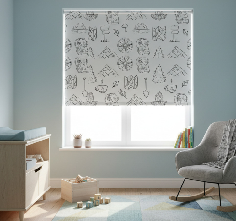 아웃도어 테마의 일러스트가 독창적으로 조화를 이루는 이 디자인은 백팩, 산, 나침반, 컵과 함께 나뭇잎과 불을 포함한 요소들을 제공합니다. 스타일화된 디테일은 탐험과 자연과의 연결감을 불러일으키며, 공간에 방황하는 열망과 모험을 초대합니다. 아동용 블라인드 손으로 그린 나침반과 산 관련 디자인