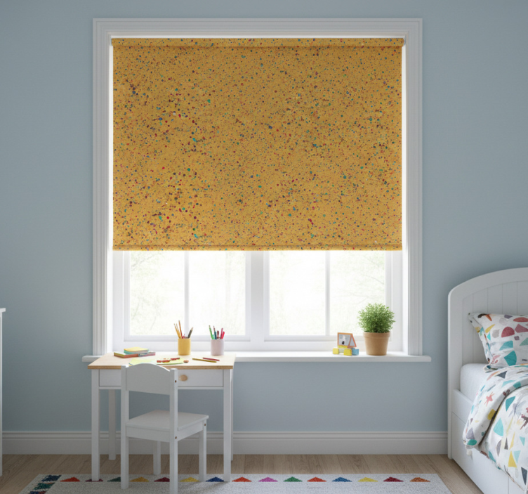활기찬 노란색 패턴이 다채로운 점과 얼룩으로 가득 차 있습니다. 이 디자인은 빨강, 초록, 파랑, 보라색의 생동감 넘치는 색조가 폭발적으로 어우러져 즐겁고 에너제틱한 분위기를 자아냅니다. 흩어진 형태들은 장난기와 창의성을 불러일으킵니다. 아동용 블라인드 작은 색깔의 튀김