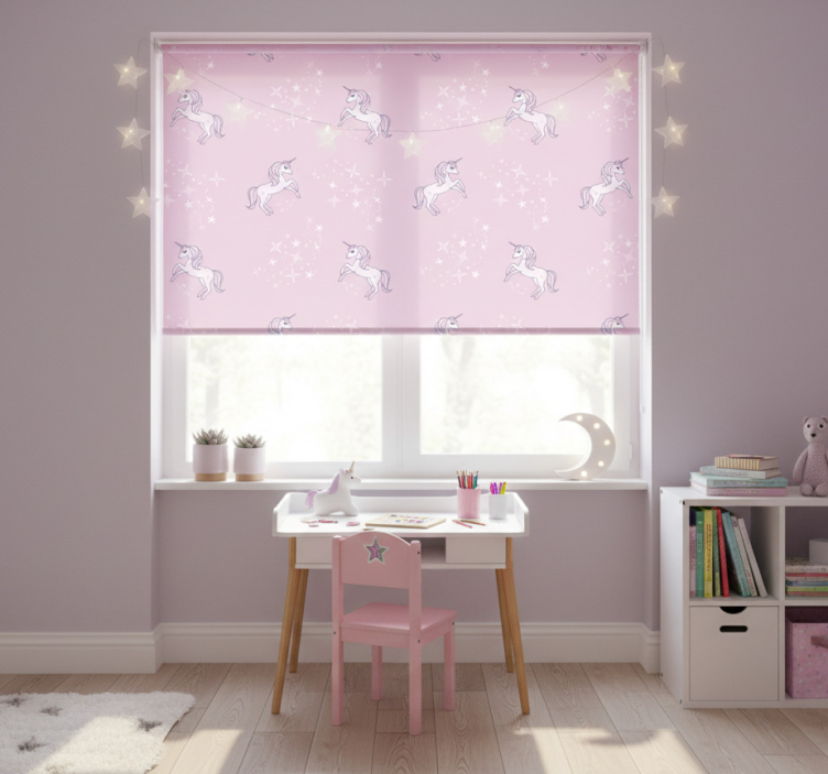 화사한 분홍색 배경에는 매력적인 유니콘들이 기발한 별과 반짝임 속에서 뛰어오르고 있습니다. 이 재미있는 디자인은 상상력과 창의력을 자극하는 매혹적인 테마로 시선을 사로잡습니다. 각 유니콘은 독특한 포즈로 이 사랑스러운 패턴에 매력을 더하고 있습니다. 아동용 블라인드 유니콘 핑크 패턴