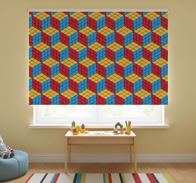 다양한 색상의 3차원 큐브가 배열된 생동감 있는 디자인으로, 빨간색, 파란색, 노란색이 포함되어 있습니다. 이 패턴은 시각적으로 자극적인 효과를 만들어내어 개별 큐브가 역동적인 배열로 서로 맞물려 있는 것처럼 보이게 합니다. 아동용 블라인드 루빅스 큐브 원형 패턴