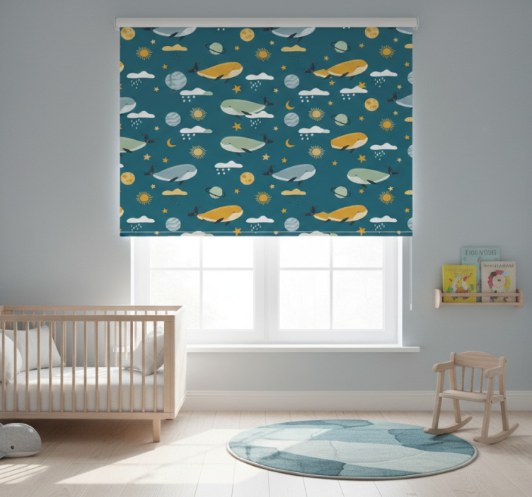 바다와 하늘의 주제를 기발하게 혼합한 디자인으로, 다양한 고래 일러스트가 생동감 넘치는 장면 속에서 헤엄치고 있습니다. 이 디자인은 행성, 별, 구름, 달, 태양 모티프를 포함하여, 어린이와 어른 모두의 상상력을 사로잡는 매혹적인 분위기를 만들어냅니다. 아동용 블라인드 트렌디한 고래 패턴