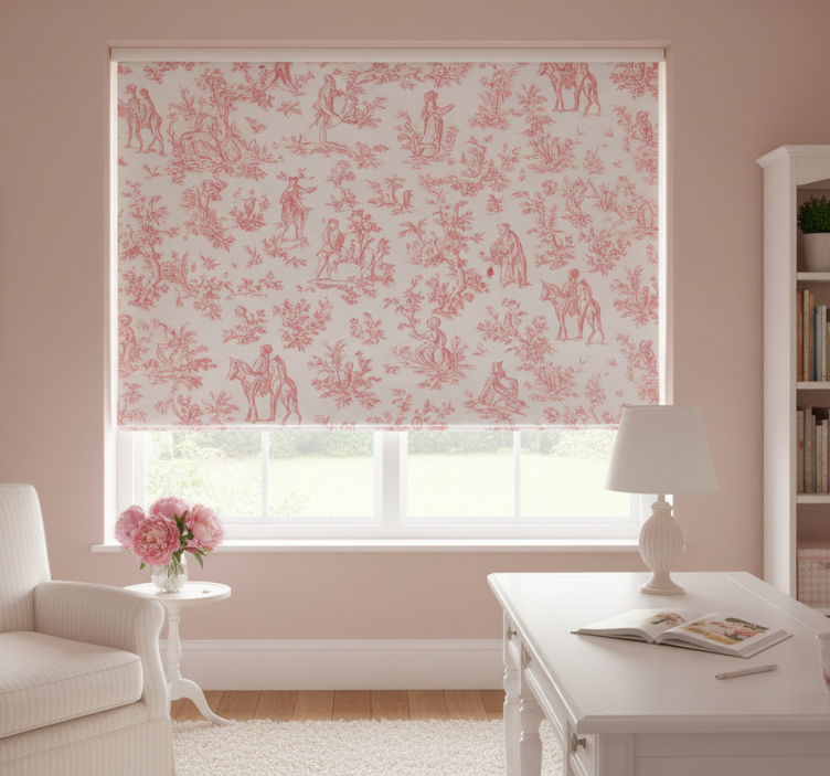 복잡한 장면은 자연 속의 인물들을 묘사하며, 캐릭터들이 야생 동물과 무성한 식물과 교감하는 모습을 포함합니다. 말에 탄 라이더들은 평화로운 풍경과 대화하며, 꽃과 녹음이 생동감을 더합니다. 이러한 요소들의 조화로운 융합은 세밀한 예술성을 통해 이야기를 전달하는 매력적인 정경을 만들어냅니다. 핑크 블라인드 빈티지 시골 디자인