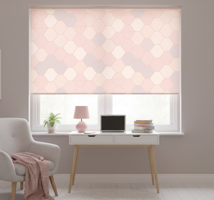이 디자인은 부드러운 핑크와 회색의 육각형 모양 배열로 구성되어 조화롭고 매력적인 미학을 만들어냅니다. 벌집 패턴의 다양한 색조와 각도가 시각적인 흥미를 제공하면서도 일관되고 평화로운 모습을 유지합니다. 현대적인 공간을 향상시키기에 이상적입니다. 핑크 블라인드 현대 추상 핑크 도형