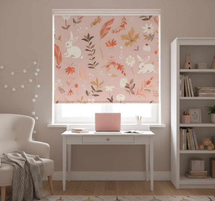 장난기 가득한 토끼들이 다양한 꽃과 잎들 사이에서 어우러진 매력적인 디자인입니다. 배경은 부드러운 핑크색으로, 선명한 주황색, 녹색, 크림색을 강조합니다. 데이지와 계절별 잎사귀 같은 요소들이 생동감 넘치는 분위기를 만들어내어, 어떤 공간에도 따뜻함과 즐거움을 초대합니다. 핑크 블라인드 가을 숲 디자인