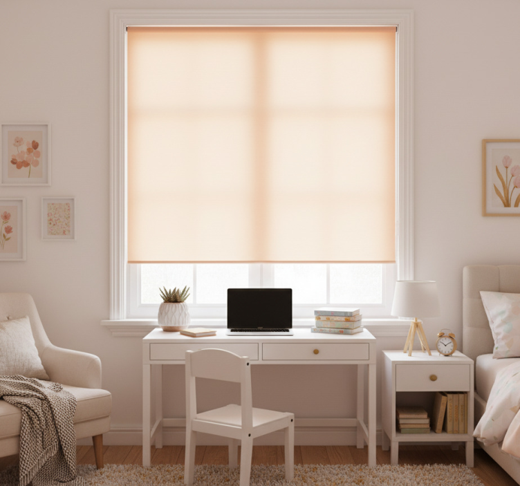 부드러운 복숭아색 창문 커버가 빛을 부드럽게 걸러 따뜻한 빛을 만들어냅니다. 근처에는 다육식물을 담고 있는 장식용 화분이 있어 자연의 싱그러움을 더합니다. 섬세한 꽃 디자인의 예술 작품이 고요한 분위기를 보완하며, 미니멀한 책상과 의자가 기능적인 작업 공간을 제공하여 편안함과 스타일을 완벽하게 조화시킵니다. 핑크 블라인드 복숭아 솜털
