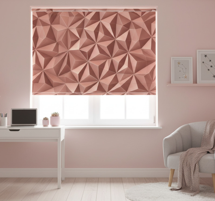 복잡한 디자인은 부드러운 복숭아 색조로 조화롭게 배열된 일련의 삼각형 형태를 특징으로 합니다. 이 입체적인 패턴은 섬세한 꽃잎이나 세련된 도시 스카이라인을 연상시키는 시각적으로 매력적인 효과를 만들어냅니다. 이러한 현대적인 미학은 시각적 매력을 높이며, 현대 디자인에 대한 신선한 관점을 제공합니다. 핑크 블라인드 로즈 골드 추상 기하학적 포일