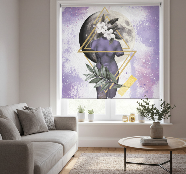 섬세한 꽃과 생기 있는 잎사귀로 장식된 인간 실루엣을 특징으로 하는 매혹적인 디자인. 그 뒤에는 기하학적 형태로 둘러싸인 보름달이 빛을 발산하고 있습니다. 배경은 보라색의 음영이 어우러져 자연과 추상적 형태가 조화를 이루는 천체적 분위기를 자아냅니다.