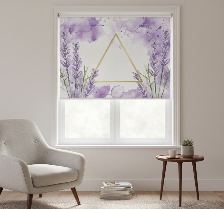 매혹적인 디자인은 부드러운 보라색 수채화 배경 위에 황금 삼각형을 아름답게 감싸는 편안한 라벤더 꽃을 특징으로 합니다. 섬세한 색상 스플래시는 고요한 분위기를 더욱 강조하며, 생동감 있는 초록색이 상쾌한 대조를 제공합니다. 이러한 예술적 조합은 조화로운 균형을 이루어 어떤 장식 스타일에도 잘 어울립니다. 퍼플 블라인드 디지털 라벤더 삼각형