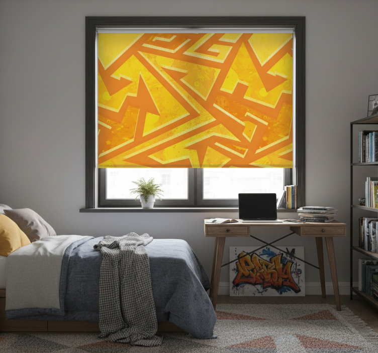 역동적인 패턴이 서로 얽힌 각진 형태로 구성되어 있으며, 눈에 띄는 노란색과 주황색의 색조가 돋보입니다. 디자인은 층이 있는 선과 역동적인 형태를 포함하여, 도시 예술을 연상시키는 에너지 넘치는 움직임의 감각을 창출합니다. 미세한 텍스처가 깊이를 더해 이 매혹적인 기하학적 예술 작품을 더욱 풍부하게 만듭니다. 청소년용 블라인드 도시 스타일