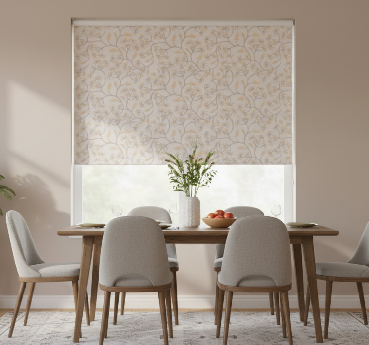 섬세한 꽃무늬가 부드럽게 얽혀 있으며, 복잡한 가지에는 꽃과 가는 잎이 장식되어 있습니다. 부드러운 베이지와 muted yellow의 색조가 편안한 미학을 만들어내고, 우아한 배열은 평온함과 자연의 아름다움을 느끼게 합니다. 레스토랑용 블라인드 가지 위의 우아한 꽃들입니다