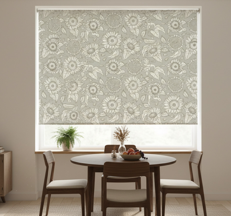 매혹적인 해바라기와 꽃잎의 배열이 자연의 느낌을 실내로 가져옵니다. 각 꽃과 잎의 섬세한 디테일이 우아한 시각적 리듬을 만들어냅니다. 부드러운 색상 팔레트가 전체적인 미적 감각을 향상시켜 어떤 공간에서도 영감을 주는 중심 요소가 됩니다. 레스토랑용 블라인드 회색 해바라기