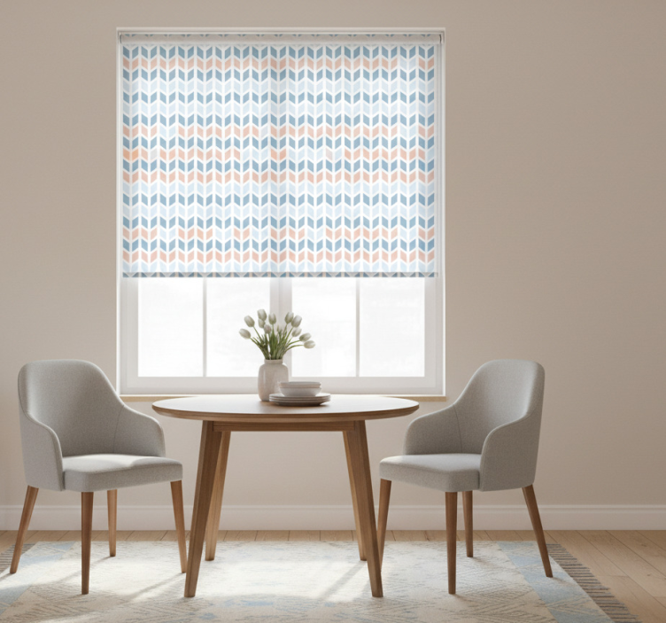 매력적인 디자인은 리드미컬한 배열의 chevron 패턴을 특징으로 합니다. 부드러운 분홍색, 파란색, 그리고 흰색의 상호작용은 평온함을 느끼게 합니다. 각 요소는 완벽하게 조화를 이루며, 고요한 풍경과 섬세한 꽃 모티프를 불러일으키는 상쾌한 시각적 경험을 제공합니다. 레스토랑용 블라인드 북유럽 스타일 수직 화살표