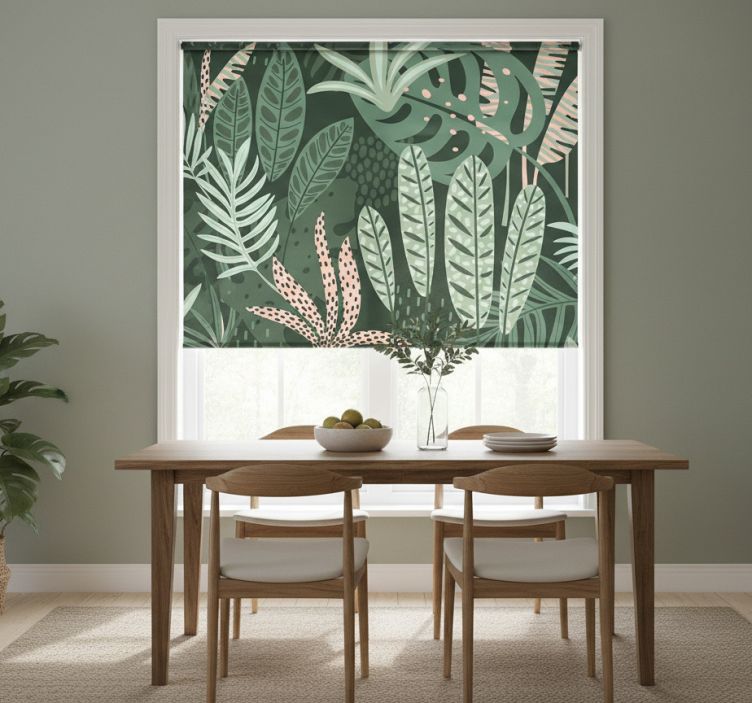 다양한 잎 모양과 점무늬가 어우러진 풍부한 열대 식물들이 무성하게 자생하고 있습니다. 이 구성은 생생한 자연의 장면을 연상시키는 복숭아 색조와 함께 풍성한 녹색을 특징으로 합니다. 넓은 야자수 같은 잎과 가느다란 잎사귀 같은 요소들이 매력적인 시각적 경험을 만들어내며, 열대의 평온함을 초대합니다. 레스토랑용 블라인드 여름의 야자수