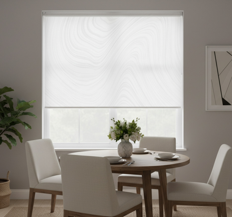 이미지는 부드럽고 물결치는 선들로 구성된 흐르는 디자인을 특징으로 하며, 다양한 흰색의 음영을 가지고 있습니다. 이러한 곡선 패턴은 고요함과 움직임을 불러일으키며, 부드럽고 유기적인 느낌을 줍니다. 전략적으로 배치된 꽃 장식이 더해져, 이 디자인은 우아함을 강조하면서도 단순함을 유지합니다. 레스토랑용 블라인드 백색 대리석 패턴 회색 줄무늬
