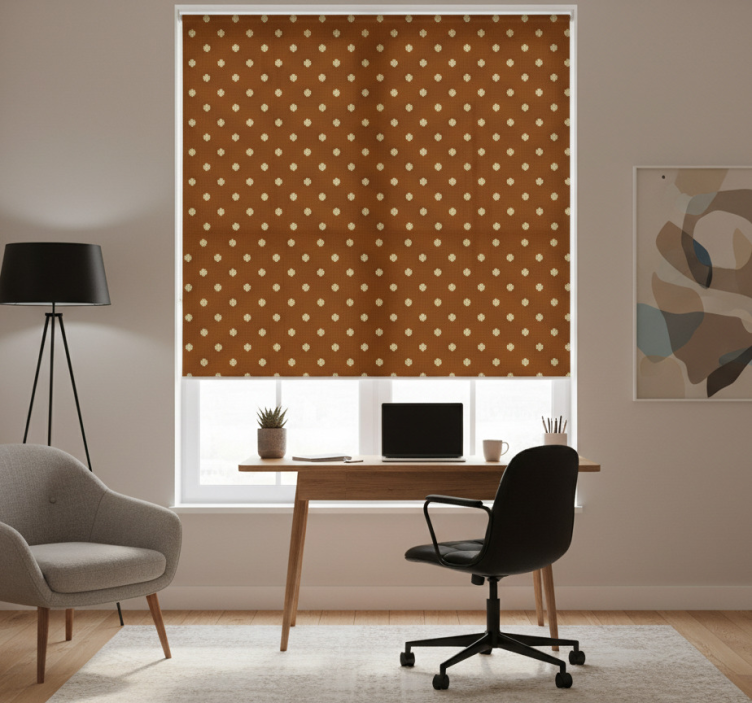 디자인은 따뜻한 갈색 배경에 작은 꽃들이 즐겁게 배열된 패턴을 특징으로 하며, 미세한 물방울 무늬가 조화를 이루고 있습니다. 이 조화로운 조합은 밝고 초대하는 시각적 매력을 제공하여 어떤 공간의 미적 감각을 향상시키기에 완벽합니다. 홈 오피스 블라인드 갈색 교차 패턴