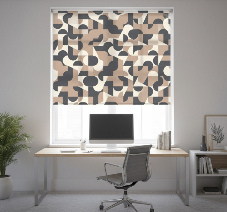 부드러운 곡선과 각진 형태가 조화를 이루는 이 디자인은 베이지, 크림, 진한 회색의 색조로 구성되어 있습니다. 복잡한 배열은 시각적으로 매력적인 패턴을 만들어내며, 원형 모티프와 다양한 기하학적 형태가 주목을 끌고 호기심을 자아냅니다. 홈 오피스 블라인드 대비 색상 패턴