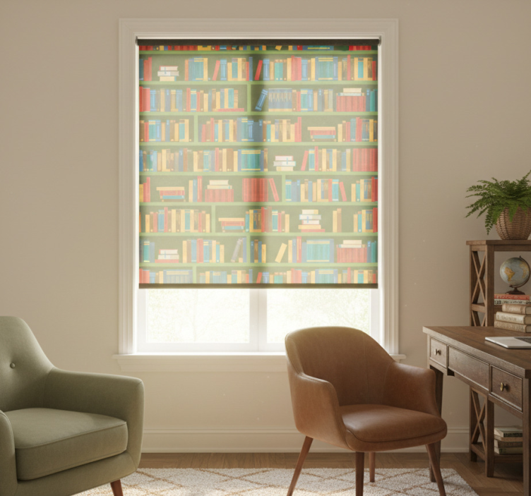 다채로운 책들이 디자인을 가득 채우고 있으며, 다양한 크기와 스타일이 특징입니다. 풍부한 빨강, 파랑, 노랑이 매력적인 시각을 만들어냅니다. 배열은 깔끔하게 정리된 도서관 선반을 닮아 있으며, 관람객이 그 안에 담긴 문학적 보물을 탐험하도록 초대합니다. 홈 오피스 블라인드 빈티지 그린 도서관