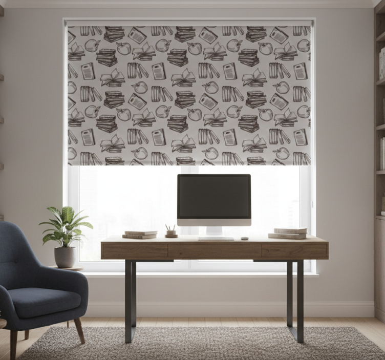 이 패턴은 단색 스타일로 정교하게 묘사된 책, 노트북, 사과의 배열을 특징으로 합니다. 다양한 책 더미와 열린 페이지는 흩어진 필기구와 함께 어우러져 문학과 교육에 대한 사랑을 담은 학문적인 분위기를 만들어냅니다. 홈 오피스 블라인드 빈티지 스터디 요소