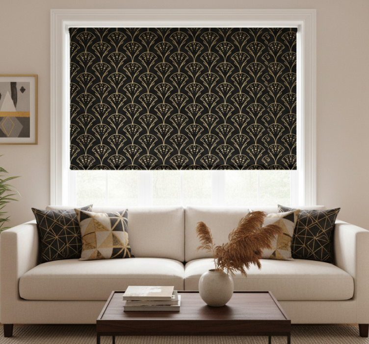 복잡한 꽃무늬가 풍부한 검은 배경에서 나타나며, 눈을 사로잡는 반복적인 패턴을 형성합니다. 섬세한 곡선과 점으로 이루어진 디테일이 조화로운 디자인을 만들어내며, 스타일리시한 기하학적 표현으로 자연의 아름다움을 불러일으킵니다. 모던 블라인드 우아한 골드 디자인