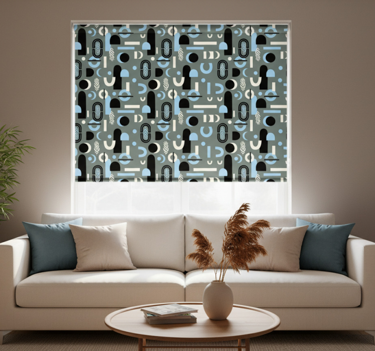 이 디자인은 반원, 수직선, 추상 형태를 포함한 기하학적 형태의 배열을 특징으로 합니다. 색상 팔레트는 파란색, 검은색, 그리고 밝은 색조를 조합하여 스타일화된 잎 모티프와 섞여 있으며, 현대 예술의 본질을 포착하는 시각적으로 매력적인 패턴을 만들어냅니다. 모던 블라인드 기하학적 도형 콜라주