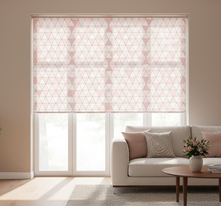 부드러운 분홍색과 크림색 톤으로 구성된 서로 맞물린 삼각형 배열을 특징으로 하는 매력적인 디자인으로, 섬세한 금색 선이 포인트를 줍니다. 이 패턴은 구조감과 조화로움을 만들어내며, 미니멀리즘 미학에 매력을 더합니다. 현대적인 인테리어에 적합한 이 디자인은 공간을 압도하지 않으면서도 우아함을 더해줍니다. 모던 블라인드 금색 선과 밝은 색상 및 질감
