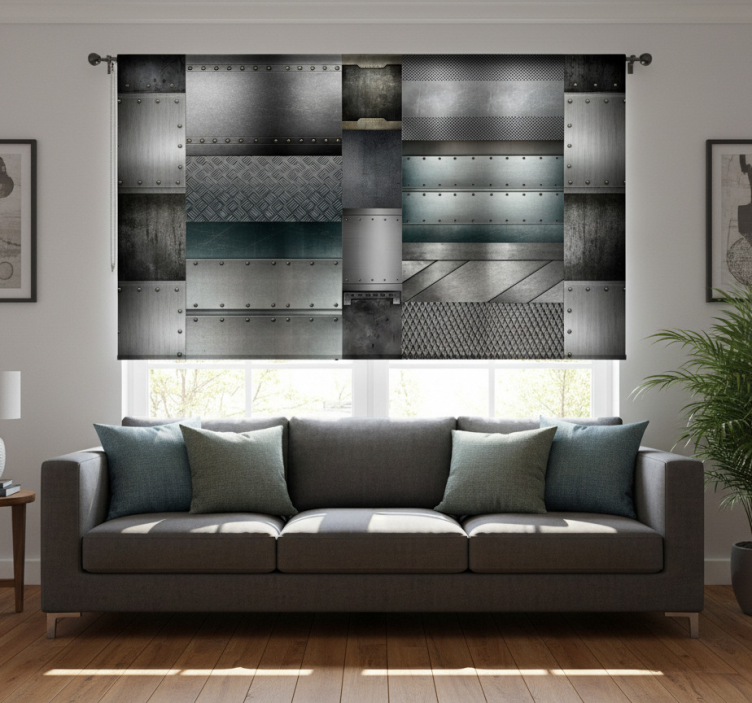 다양한 패턴이 포함된 매력적인 금속 질감의 배열은 다이아몬드 플레이트와 메쉬와 같은 요소를 통합합니다. 표면은 은빛 회색에서 깊은 파란색에 이르는 다양한 색조를 보여주며, 리벳과 깔끔한 선들이 산업적인 미학을 강조합니다. 현대적인 장식에 완벽한 시각적으로 인상적인 디자인입니다. 모던 블라인드 메탈 블랙 블록 패턴