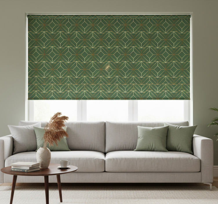 복잡한 패턴은 조화롭게 배열된 일련의 기하학적 형태로 구성되어 있으며, 부드러운 자연적인 선들이 가미된 다양한 녹색 음영을 특징으로 합니다. 이 디자인은 자연의 느낌을 불러일으키며, 잎사귀와 유기적인 형태를 연상시킵니다. 리드미컬한 반복이 시각적인 흥미를 만들어내며, 현대적인 미학과 우아함이 조화를 이루고 있습니다. 모던 블라인드 금색 테두리의 메탈릭 그린 사각형