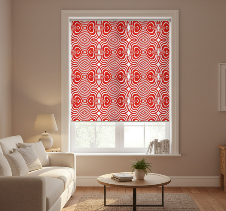 상징적인 하트 모양이 얽혀 있고 소용돌이치는 선들로 강조된 생동감 넘치는 디자인입니다. 리드미컬한 패턴은 움직임과 조화의 느낌을 만들어내어 로맨틱한 주제를 강조합니다. 깊은 빨간색이 섬세한 흰색 디테일과 대비를 이루어, 이 작품은 다양한 장식 용도로 눈길을 끌기 좋은 선택입니다. 모던 블라인드 매혹적인 하트 패턴 장식입니다.