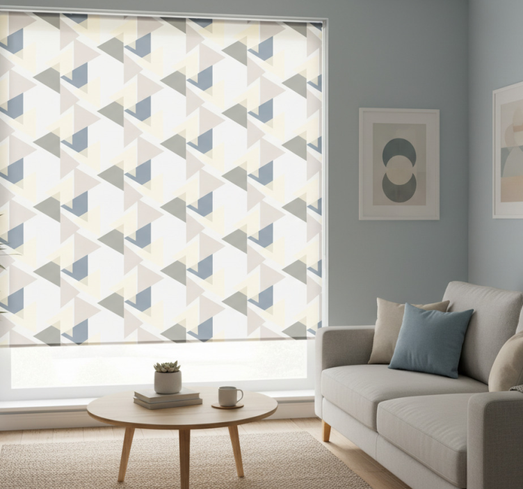 디자인은 부드러운 색조의 삼각형 모양이 복잡하게 배열된 패턴을 특징으로 하며, 부드러운 파랑, 회색, 크림색이 포함되어 있습니다. 이 기하학적 구성은 균형감을 제공하며, 색상의 미묘한 상호작용이 더해져 현대적이면서도 매력적인 미학을 창출합니다.
