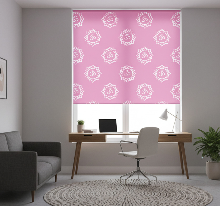 부드러운 분홍색 패턴이 반복되는 원형 모티프를 보여주며, 중앙에는 두드러진 심볼이 자리잡고 있고, 복잡한 세부 장식으로 둘러싸여 있습니다. 이 디자인은 평온함과 조화로운 느낌을 불러일으켜, 어떤 공간에도 차분한 미학을 더하는 데 완벽합니다. 사무실 블라인드 아름다운 크라운 차크라 심볼