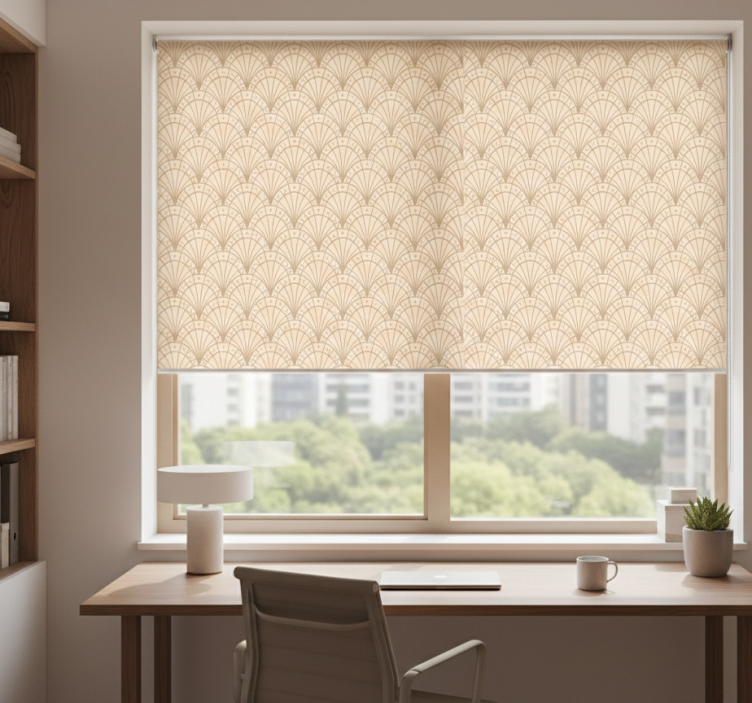 팬 모양의 복잡한 디자인이 반복적으로 배열된 이 비주얼은 조화와 세련됨을 포착합니다. 따뜻한 색조와 섬세한 선들이 결합되어 정제된 미학을 만들어내어, 예술적인 터치로 공간을 강화하고자 하는 이들에게 이상적인 선택이 됩니다. 사무실 블라인드 우아한 팬 모티프