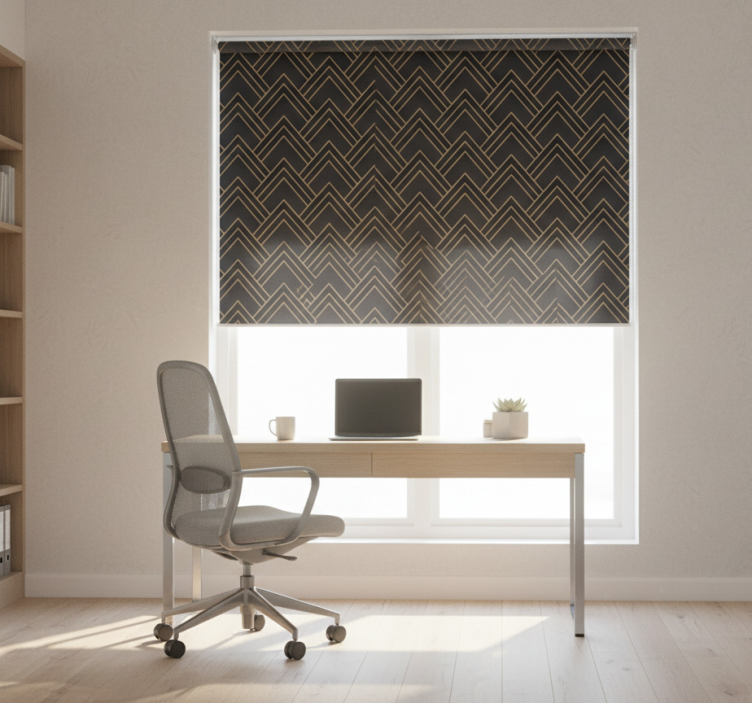 눈에 띄는 디자인은 풍부한 검정색과 금색 조합의 맞물린 세로줄로 구성되어 있습니다. 역동적인 패턴은 움직임과 깊이감을 만들어내어 시각적인 흥미를 더합니다. 현대적인 인테리어에 완벽하게 어울리는 이 디자인은 어떤 공간에도 세련미와 매력을 더합니다. 사무실 블라인드 기하학적 캐스케이드