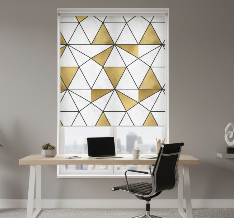 흰색과 금색의 맞물린 삼각형으로 구성된 눈에 띄는 패턴은 그 가장자리를 정의하는 검은 선으로 강조됩니다. 이러한 기하학적 형태는 흥미로운 시각적 흐름을 만들어내며, 다양한 환경에 적합한 현대적인 미학을 구현합니다. 독특하고 세련된 이 디자인은 어떤 장식에도 우아함을 더해줍니다. 사무실 블라인드 기하학적 대리석 효과는 현대적이고 세련된 디자인으로 사무실 공간을 한층 더 고급스럽게 만들어 줍니다. 독특한 기하학적 패턴과 대리석 효과는 단순한 블라인드 이상의 매력을 제공하며, 공간에 예술적인 터치를 더해줍니다. 이 제품은 단순히 기능성에 그치지 않고, 사무실의 전체적인 분위기를 개선하는 데 큰 역할을 합니다.