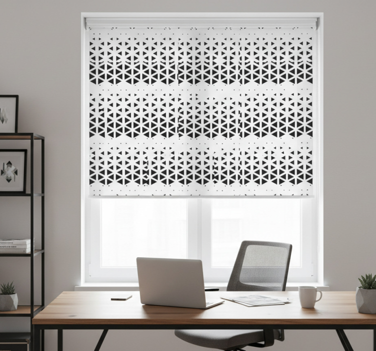 눈에 띄는 흑백 패턴은 구조적으로 배열된 서로 연결된 삼각형으로 구성되어 있습니다. 이 디자인은 단단한 형태와 윤곽이 있는 형태가 번갈아 나타나면서 깊이의 환상을 만들어내어 시선을 표면 위로 이끌어냅니다. 복잡한 세부 사항이 동적인 시각적 매력을 더해주어 어떤 환경에서도 두드러진 요소가 됩니다. 사무실 블라인드 기하학적 그라데이션 효과
