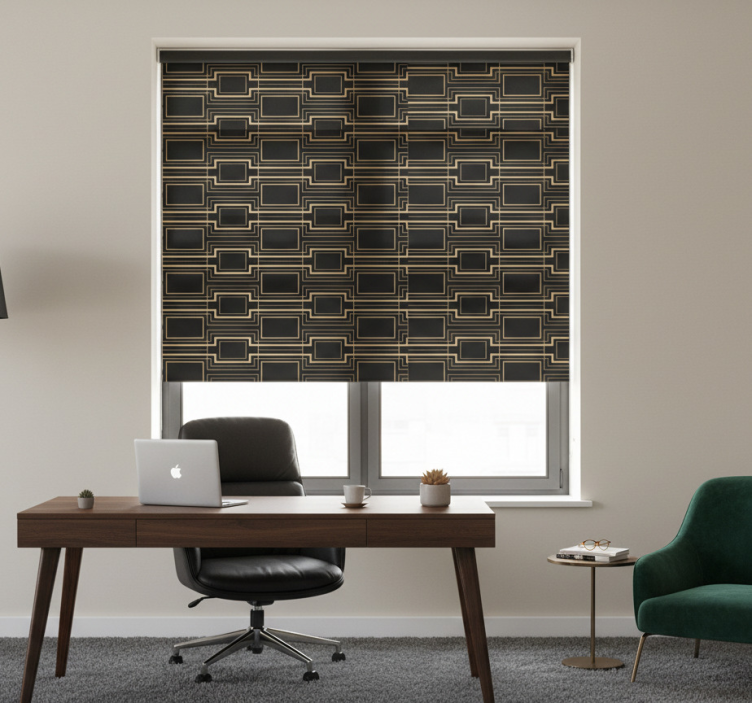 눈에 띄는 디자인으로, 섬세한 금색으로 윤곽이 그려진 일련의 맞물린 직사각형 형태가 깊은 배경 위에 배치되어 있습니다. 이러한 배열은 도시 그리드와 현대 건축을 연상시키는 움직임과 깊이의 감각을 만들어내며, 주목을 끄는 독특한 작품이 됩니다. 사무실 블라인드 금테 아트 장식 패턴은 현대적이고 세련된 디자인으로, 사무실 공간을 한층 더 아름답게 만들어줍니다. 이 제품은 독특한 패턴과 고급스러운 금테 디테일로 구성되어 있어, 어떤 인테리어와도 잘 어우러지며, 세련된 분위기를 연출합니다. 특히, 이 블라인드는 직사광선으로부터 방을 보호하고 실내 온도를 조절해주는 기능이 있어, 사용자의 편안한 환경을 만들어줍니다.
