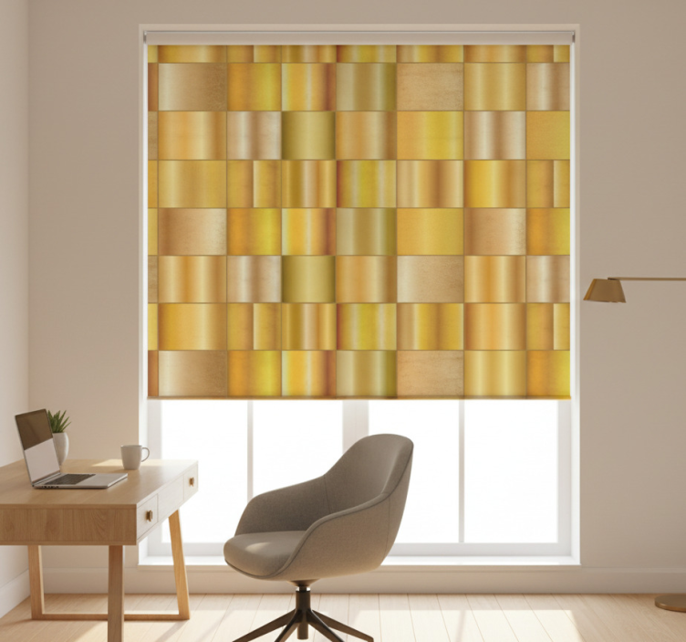 다양한 금색의 섬세한 배열이 놀라운 기하학적 패턴을 만들어냅니다. 디자인은 교차하는 정사각형과 직사각형 형태를 특징으로 하며, 따뜻함과 세련됨을 불러일으키는 질감의 조화를 보여줍니다. 어떤 환경에도 우아함을 더하는 데 이상적이며, 부드러운 색조가 아름답게 조화를 이룹니다. 사무실 블라인드 금색 노란색 블록