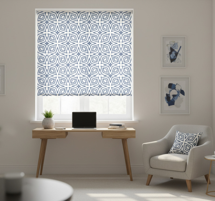 상호 연결된 기하학적 형태로 구성된 반복적인 별 패턴을 특징으로 하는 매력적인 디자인. 복잡한 레이아웃은 각기 뚜렷한 파란색으로 윤곽이 그려진 다이아몬드와 삼각형의 시각적으로 매력적인 배열을 형성합니다. 이 패턴은 어떤 장식 스타일에도 현대적인 느낌을 더하며, 질서와 우아함을 구현합니다. 사무실 블라인드 수제 모조 황마 다이아몬드