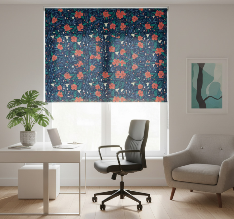 풍부한 꽃 요소로 가득 찬 생동감 넘치는 패턴으로, 깊은 네이비 배경에 striking red blooms이 돋보입니다. 섬세한 잎과 작은 꽃들이 얽혀 있어 자연을 실내로 초대하는 매력적인 구성을 만듭니다. 복잡한 디자인은 색상과 형태의 조화를 이루어 어떤 공간에도 신선한 터치를 더합니다. 사무실 블라인드 북유럽 스타일 아트 플라워