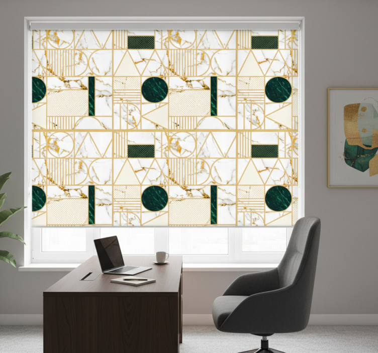 복잡한 디자인은 기하학적 형태의 조화를 이루며, 원형과 삼각형 패턴이 고급스러운 금색 선 사이에 배치되어 있습니다. 풍부한 녹색 요소가 크리미한 대리석 질감과 어우러져 조화로운 시각적 리듬을 만들어냅니다. 전체적인 구성은 형태와 색상의 매력적인 상호작용을 통해 미적 매력을 높이고 있습니다. 사무실 블라인드 화이트 대리석 기하학적