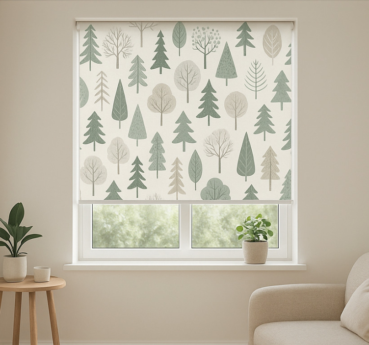 다양한 나무들이 조화를 이루며 섬세한 녹색과 자연의 색조를 보여줍니다. 침엽수와 잎이 없는 나무를 포함한 다양한 나무 스타일이 생기 넘치는 자연 풍경을 만듭니다. 이 디자인은 숲의 평온함을 구현하여 어떤 공간에도 신선한 자연의 느낌을 더해줍니다. 스칸디나비아 스타일 블라인드 편안한 스칸디나비아 숲