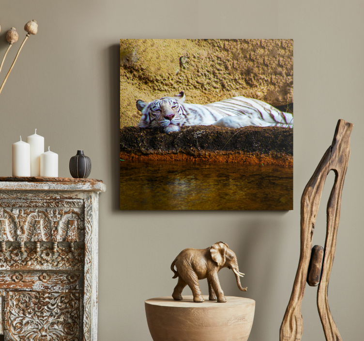 조용한 순간이 포착되었습니다. 백호가 물가에 누워 평온한 태도를 드러내고 있습니다. 호랑이는 질감이 있는 배경에 기대어 독특한 줄무늬와 평화로운 표정을 강조하며, 자연 요소들로 둘러싸여 장면을 더욱 돋보이게 하고 있습니다.