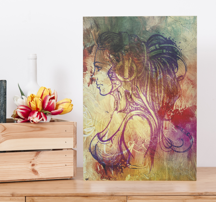 질감이 있는 배경에 정교하게 그려진 흩날리는 머리의 여성 실루엣 프로필. 이 디자인은 여성성을 담아내며 세밀한 선 작업과 생동감 넘치는 색상의 조화를 보여주어 예술성과 표현이 조화롭게 어우러진 모습을 만들어냅니다.