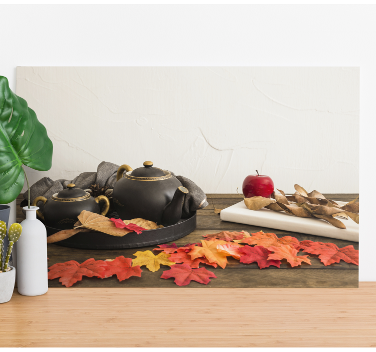 참조:: Q5848이 아늑한 배치에는 가을의 따뜻한 색조가 담겨 있으며, 어두운 찻주전자를 세트로 하여 생기 있는 잎사귀와 광택이 나는 빨간 사과가 함께 있습니다. 거친 나무 표면은 계절의 매력을 더해주며, 가을의 본질을 기념하는 환영하는 분위기를 만들어냅니다.