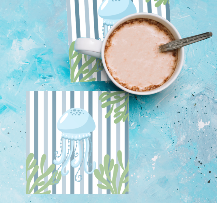 해양 식물과 얽힌 해파리가 줄무늬 배경 위에 있는 장난스러운 패턴. 이 디자인은 해양의 기발한 본질을 포착하여 해양 생물과 대담한 선을 결합하여 상쾌하고 생동감 넘치는 시각적 경험을 만들어냅니다.