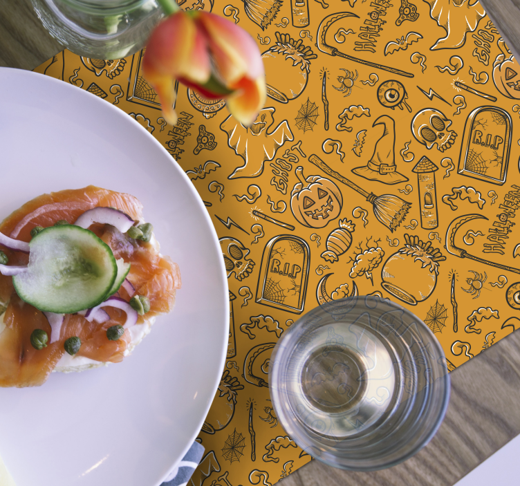 플레이스매트 유령 같은 할로윈 모티프할로윈을 기념하기 위해 디자인된 이 플레이스매트 유령 같은 할로윈 모티프는 화려한 오렌지 색상과 함께 무늬로 장식되어 있으며, 유령과 두개골, 호박, 거미, 묘비의 그림이 어우러져 있어 축제 분위기를 한층 더합니다. 이 제품은 단순한 장식이 아니라 할로윈의 정수를 담고 있는 필수 아이템입니다.