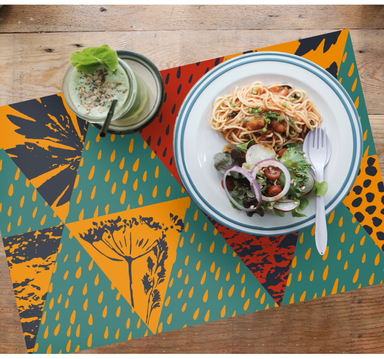 참조:: M5096대담한 기하학적 패턴과 삼각형에 얽힌 꽃 모티프가 특징인 눈에 띄는 디자인. 생생한 색상 조합이 현대적인 매력을 더해 주어, 현대적인 식사 경험에 완벽합니다. 독특한 배열이 시선을 사로잡으며 어떤 환경에서도 신선한 미학을 제공합니다.